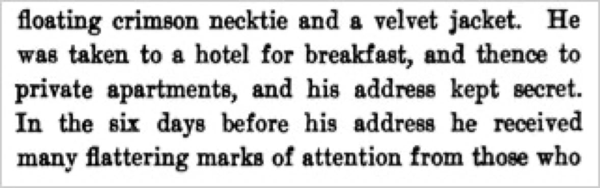 In an interview with the Boston Globe Wilde said, 'In New York there were about a hundred [reporters] a day. I had to leave my hotel and go to a private house when I wanted to push along my work'. [3] Wilde's refuge was a private apartment on 28th Street. The location was ostensibly to be kept secret, although he still did give the occasional interview from this address [4].