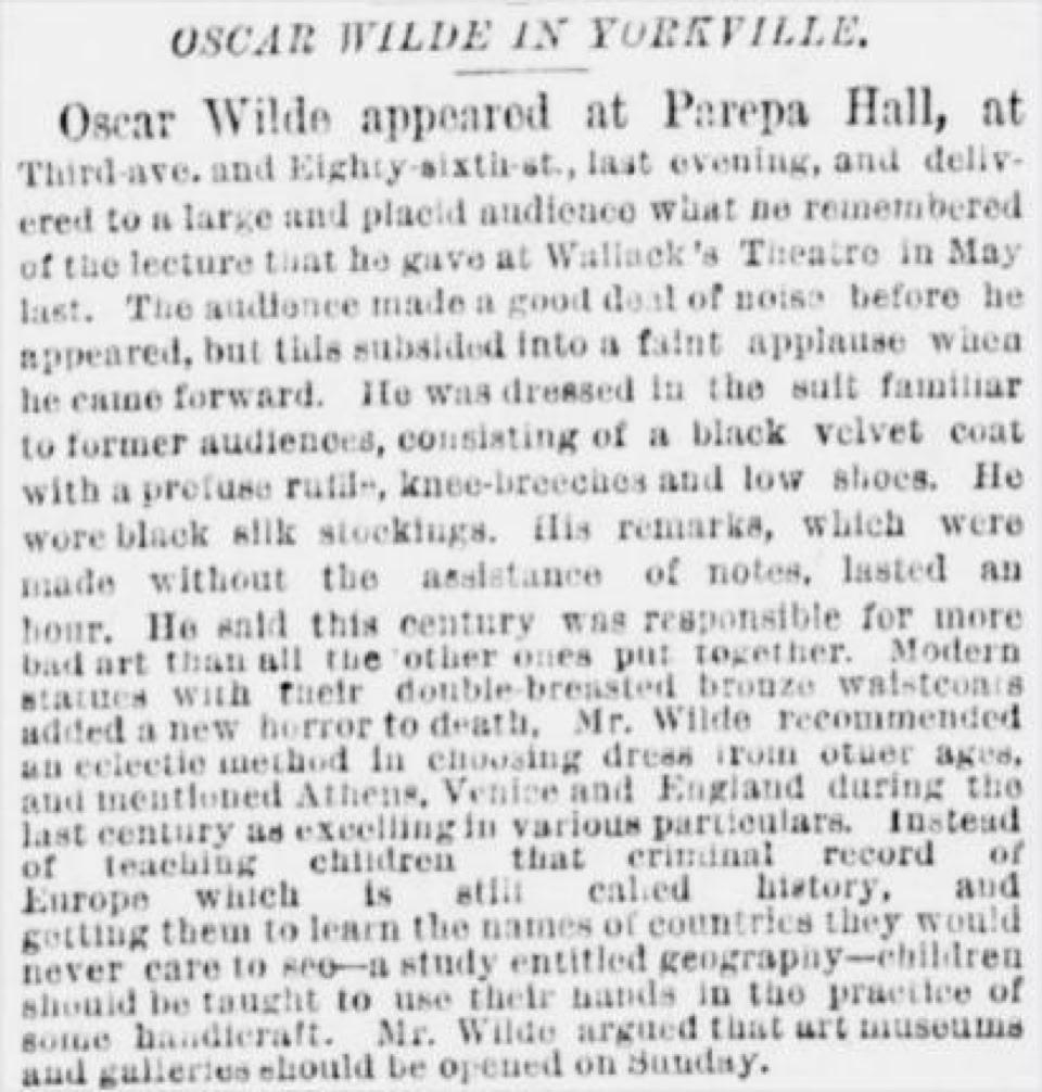 That lecture is an appearance by Wilde at Parepa Hall, in the Yorkville district of New York City, on November 27, 1882.