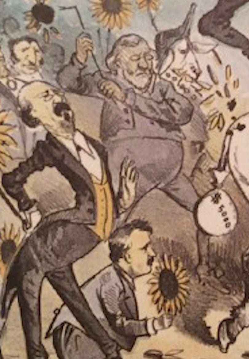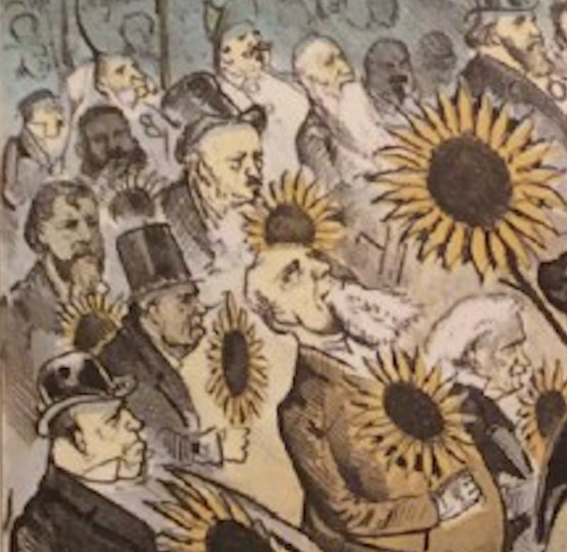 The cartoon shows such a crowd, but in satirical style, heavily featuring sunflowers, one of the floral emblems of the aesthetic movement; another, calla lilies, known to decorate Wilde's dinner table, serve as the donkey's ears.