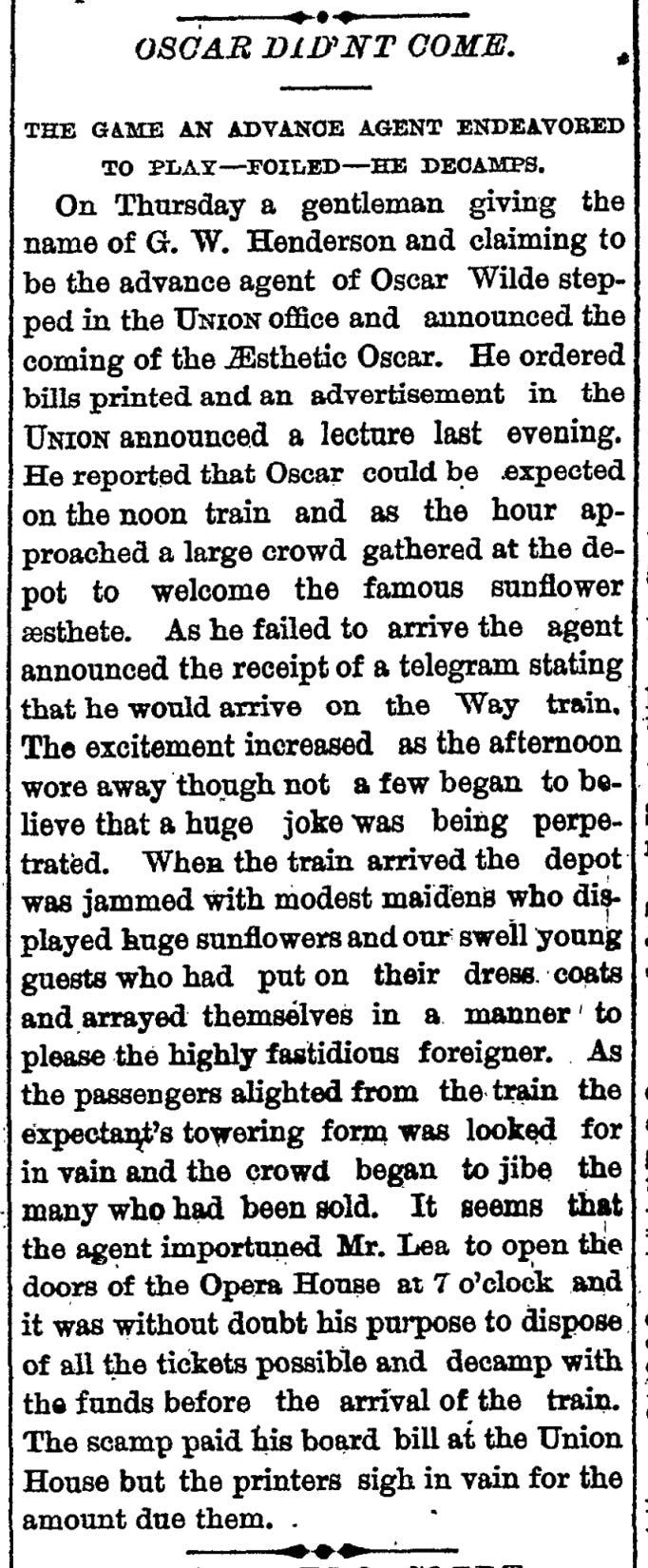 Opposite is an advertisement for a lecture at Port Jervis which did not take place. See the accompanying report of a G.W. Henderson claiming to be an agent for Oscar Wilde.