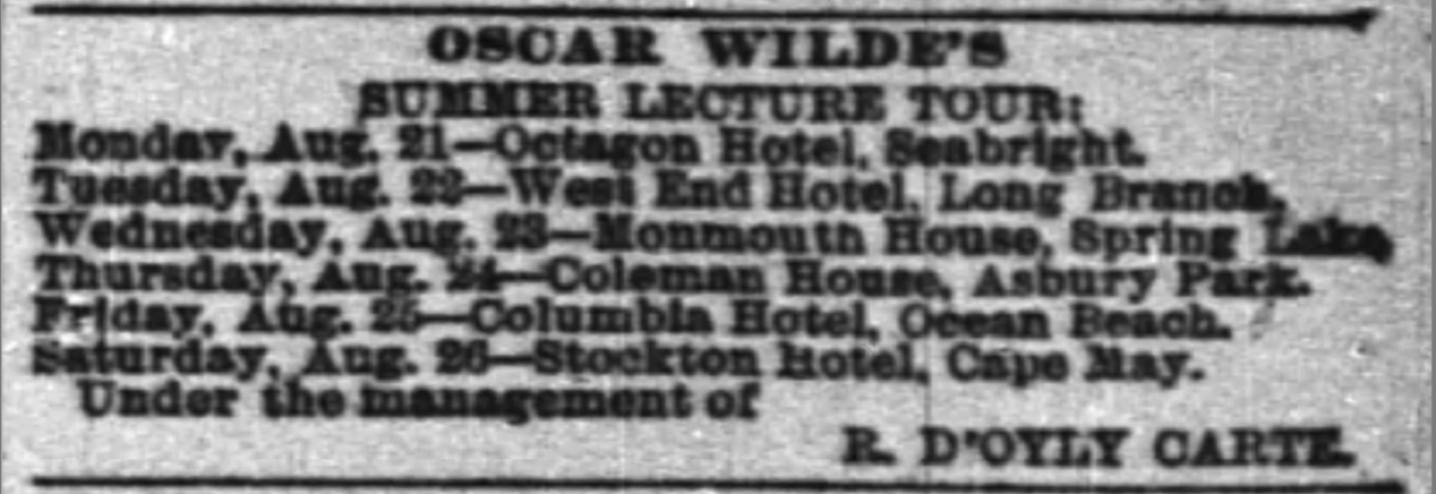 The above itinerary of Wilde lectures along the Jersey Shore was published on August 20th, 1882 and carries the imprimatur of Wilde’s tour sponsor Richard D’Oyly Carte. So in both authority and proximity to events one would expect the itinerary to be accurate. However, Wilde’s plans were changeable during the more relaxed summer months and there is doubt that the advertised lectures in Spring Lake and Ocean Beach (Belmar) took place.