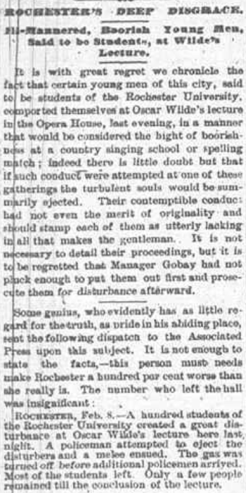 Police were called to Wilde’s lecture after students from Rochester University caused a disturbance and had to be ejected.