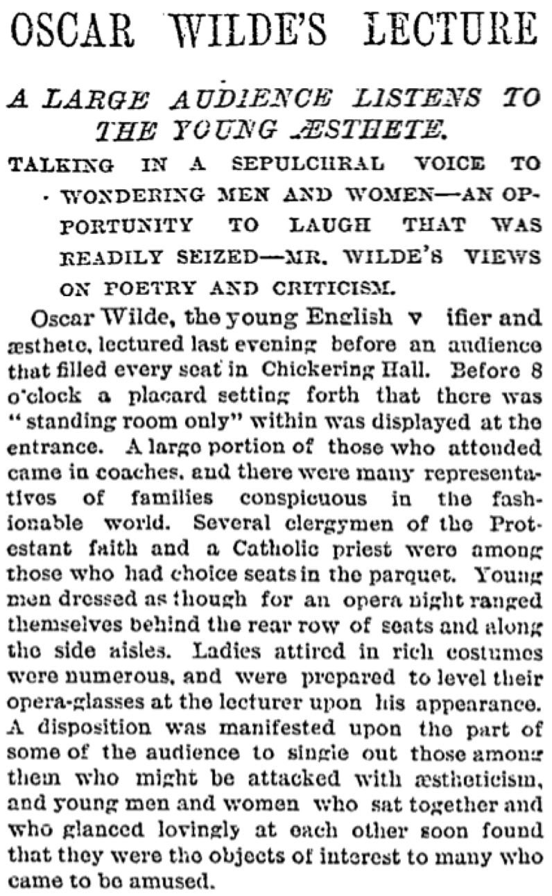 .."I have the honor", said the Colonel in a clear voice that was heard all over the hall, "to introduce to you Oscar Wilde the English (sic) poet, who will deliver his lecture upon the 'English Renaissance.'"