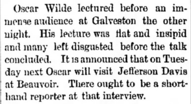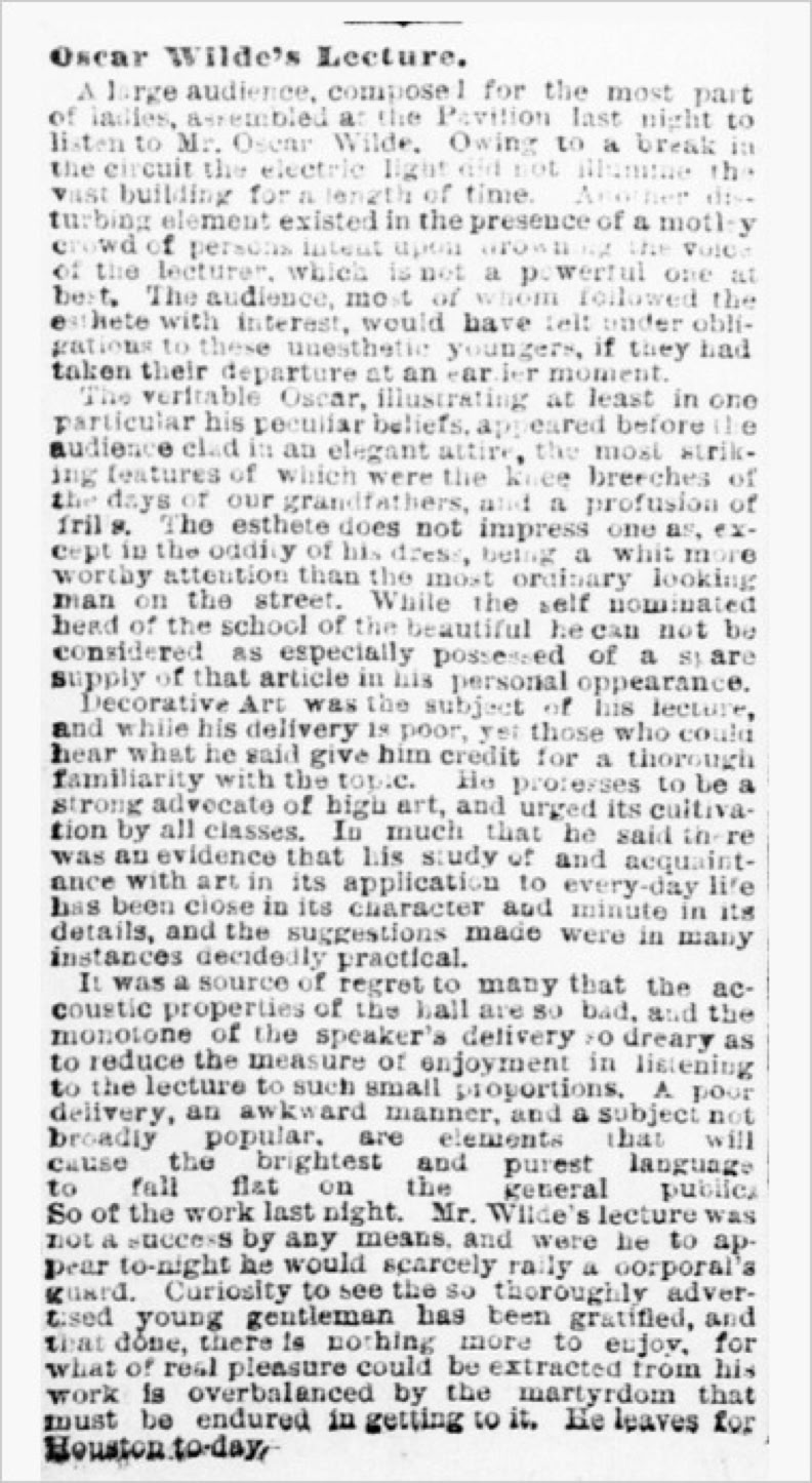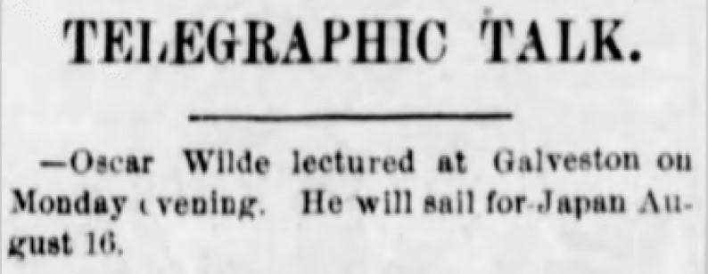 Wilde's lecture venue in Galveston had a short lifetime: it was destroyed by fire less than two and half years after it was built as the state's first building with electric lighting, and just over a year after Wilde lectured there.