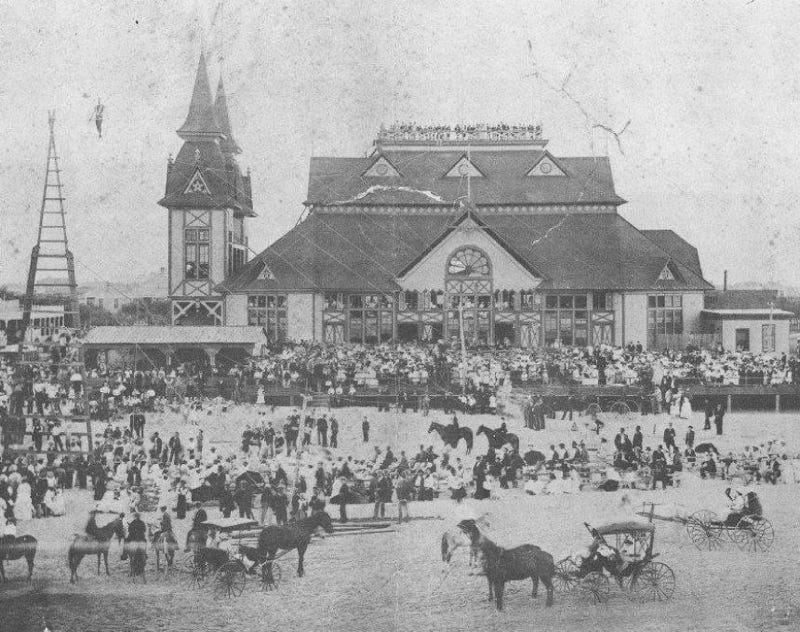 * This photograph is sometimes shown incorrectly reversed; the towers of the building were on the left when viewed from the beach.