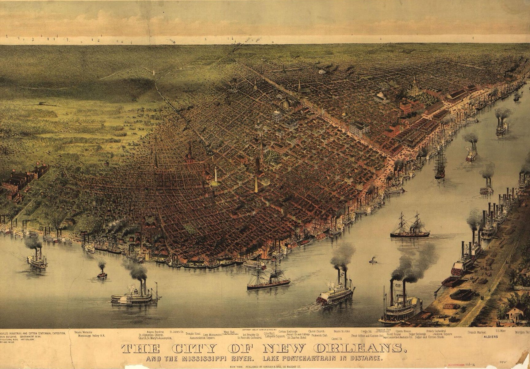 The City of New Orleans c. 1885 with the Mississippi River in the foreground, and Lake Pontchartrain on the horizon. Spanish Fort is on the lake in the distance, a five mile journey by steam train from the depot at Canal and Basin Streets, price fifteen cents.