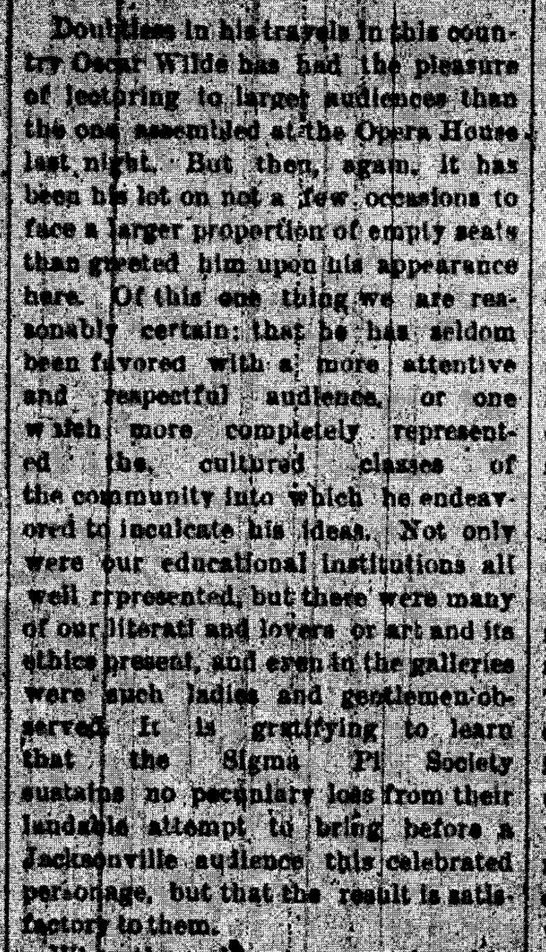 Wilde's lecture in Jacksonville, IL. It took place on one of eleven consecutive days that Wilde lectured in eleven different cities, often in rural areas to smaller houses. In 1882, Jacksonville was a city of around 11,500 (and had grown to only 19,446 at the 2010 census).