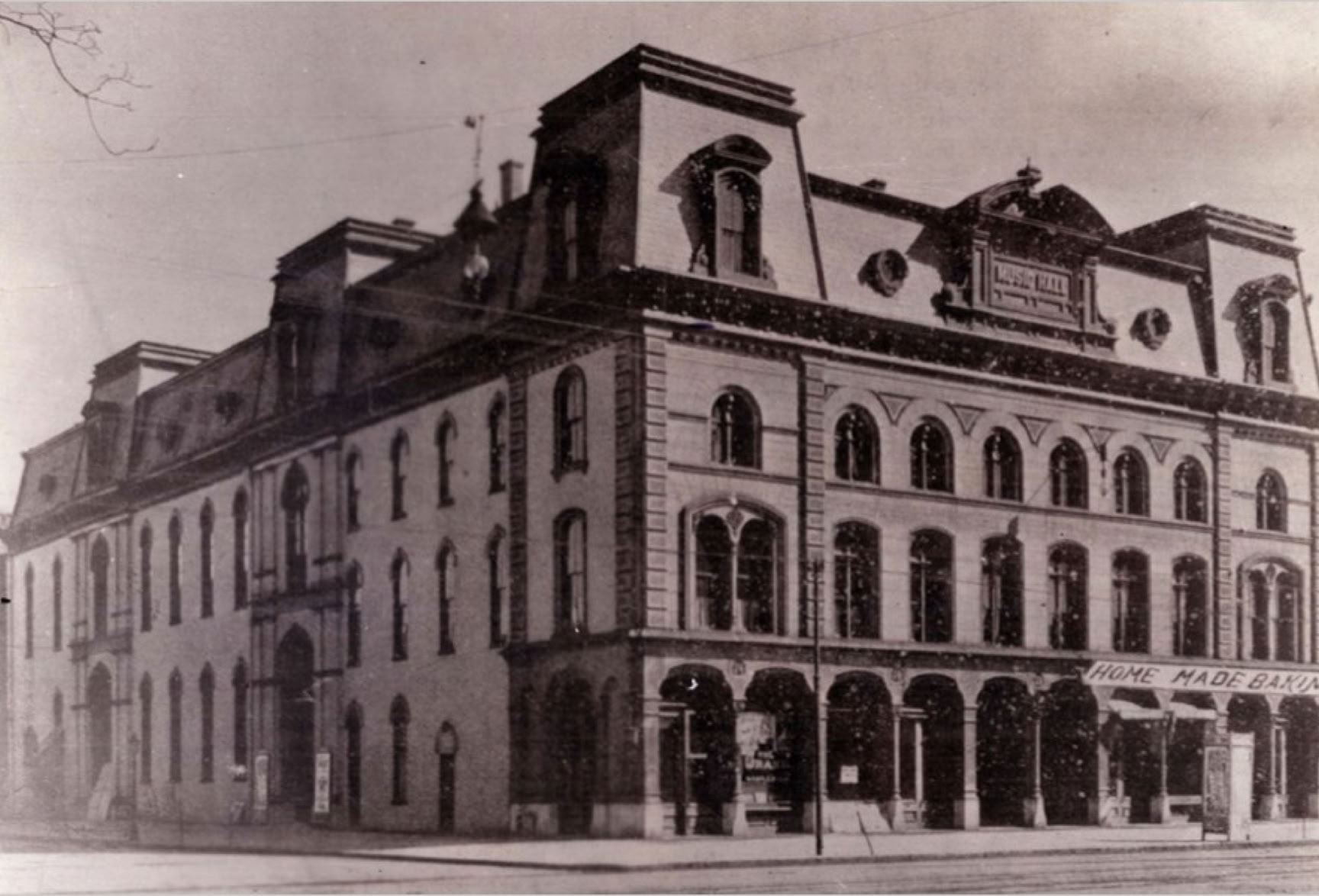 Premises: when the six-story Turner Opera House (1866) was destroyed by fire on May 16, 1869, a three-story edifice was rebuilt incorporating only a part the surviving facade of its predecessor; it resumed operations as the Music Hall