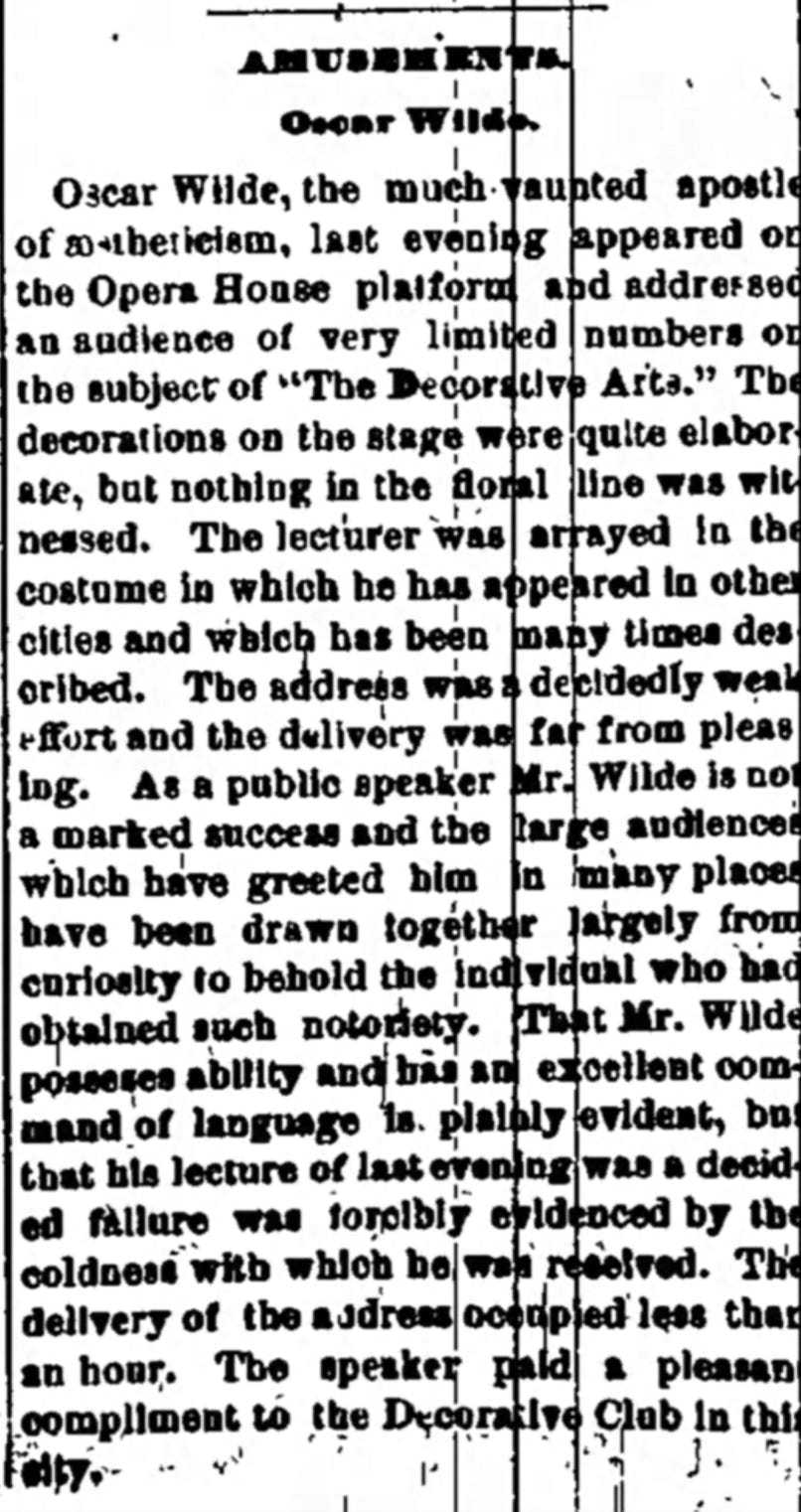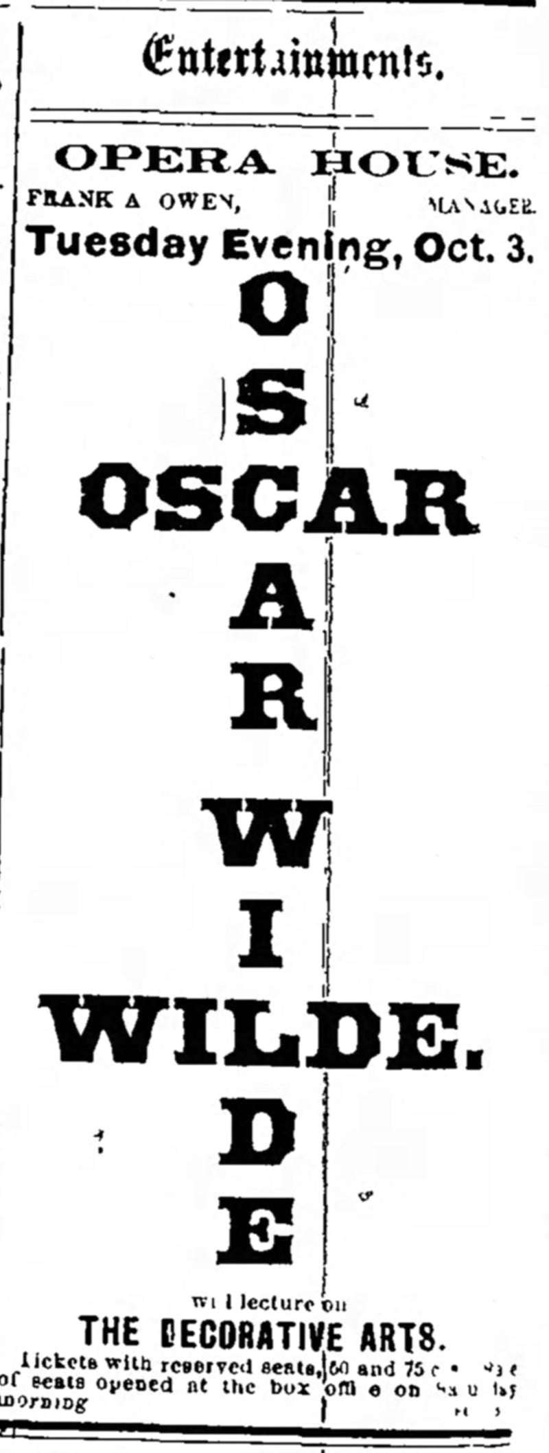 "What's coming? Oscar Wilde, to be sure. Coming! He is here in fact, and will deliver his lecture on 'Decorative Arts' in Wamsutta Opera House this evening ...