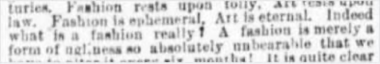 ”Fashion rests upon folly. Art rests upon law. Fashion is ephemeral. Art is eternal. Indeed what is a fashion really? A fashion is merely a form of ugliness so absolutely unbearable that we have to alter it every six months! It is quite clear that were it beautiful and rational we would not alter anything that combined those two rare qualities. And wherever dress has been so, it has remained unchanged in law and principle for many hundred years."