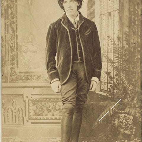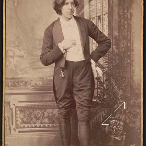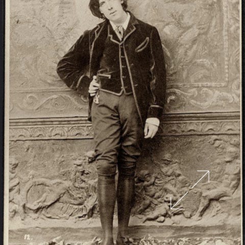 The item hanging below Wilde’s vest is a bunch of seals (used for sealing wax impressions). Wilde later said that waistcoats will show whether a man can admire poetry or not.
