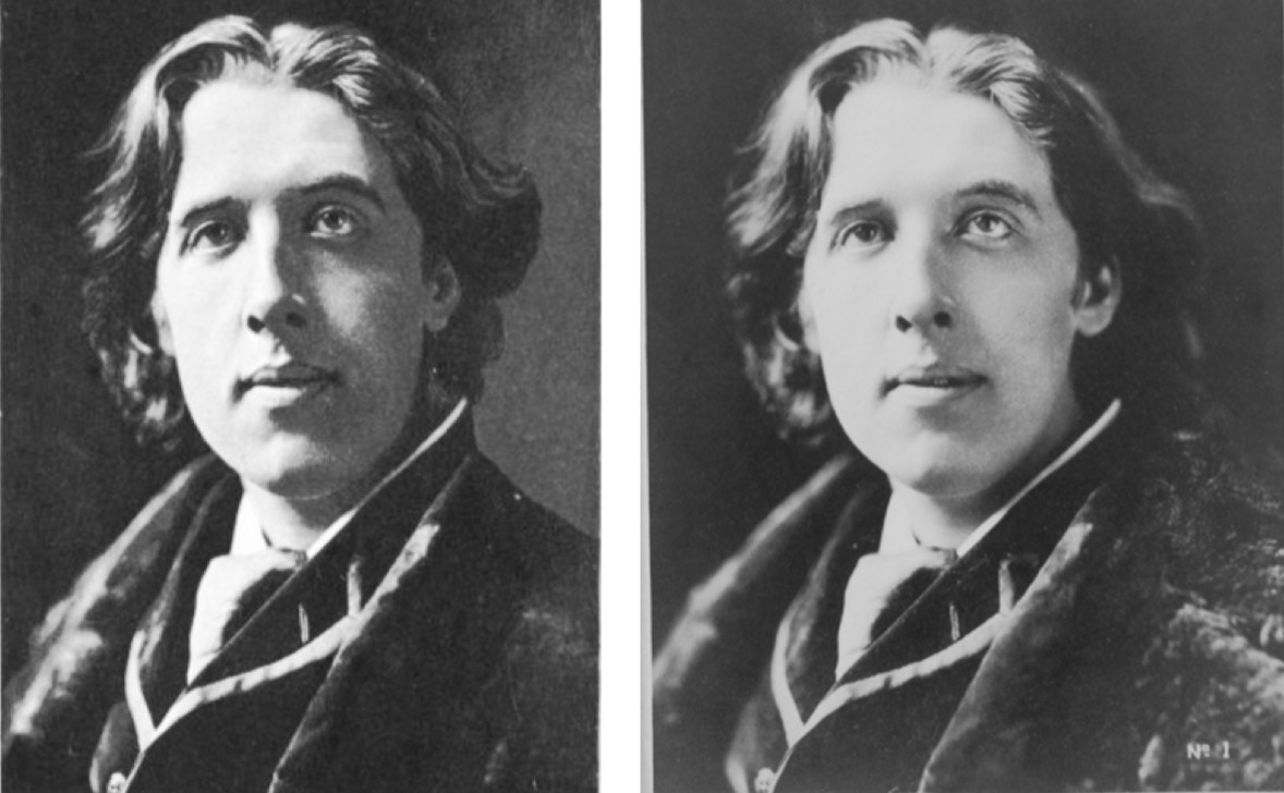 Two versions of Sarony No. 1—the famous iconic headshot of Wilde. The one on the right is the more familiar, but they do not quite look the same.