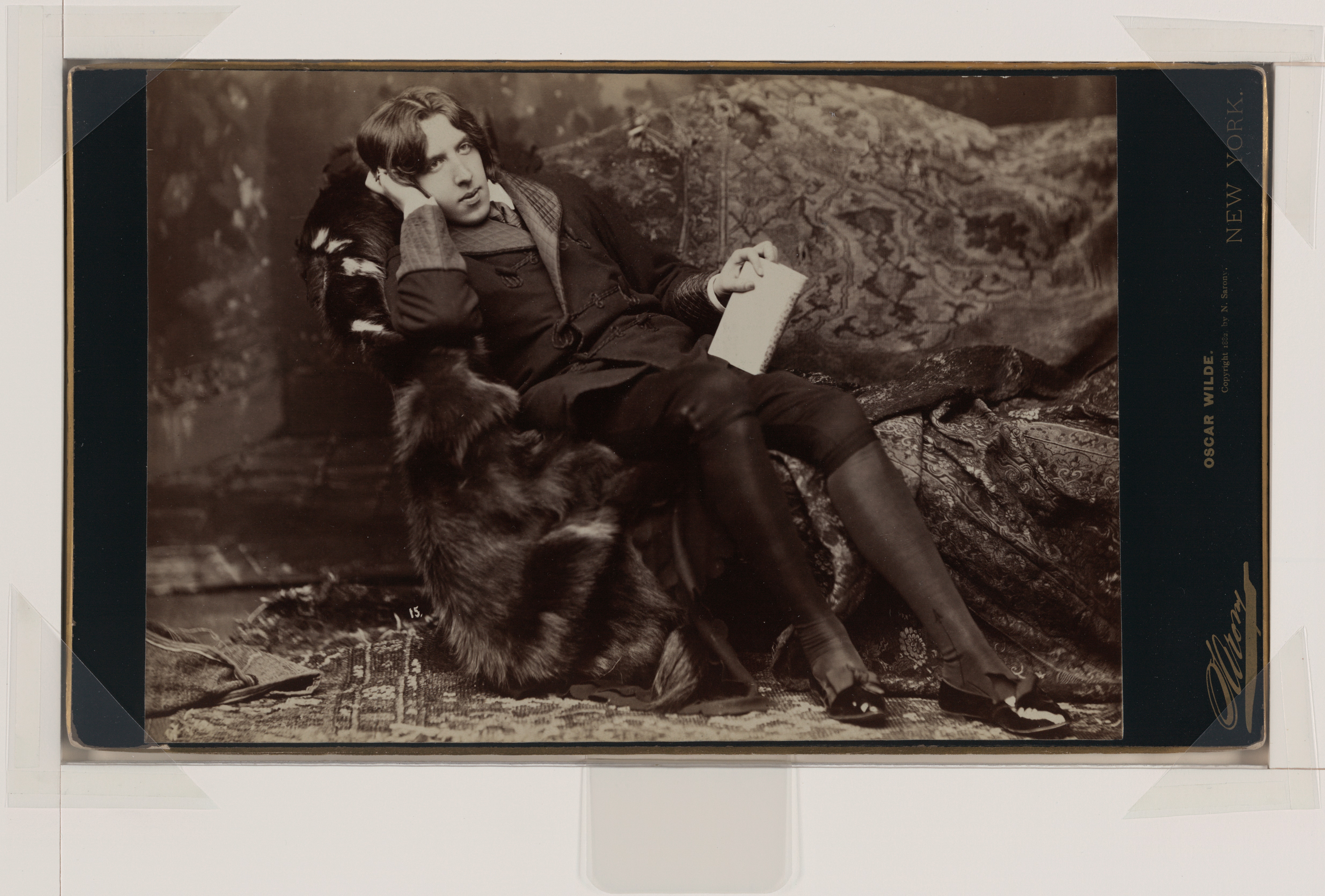 One of two photographs with the inscribed number 9. Wilde is holding a copy of his Poems (1881).