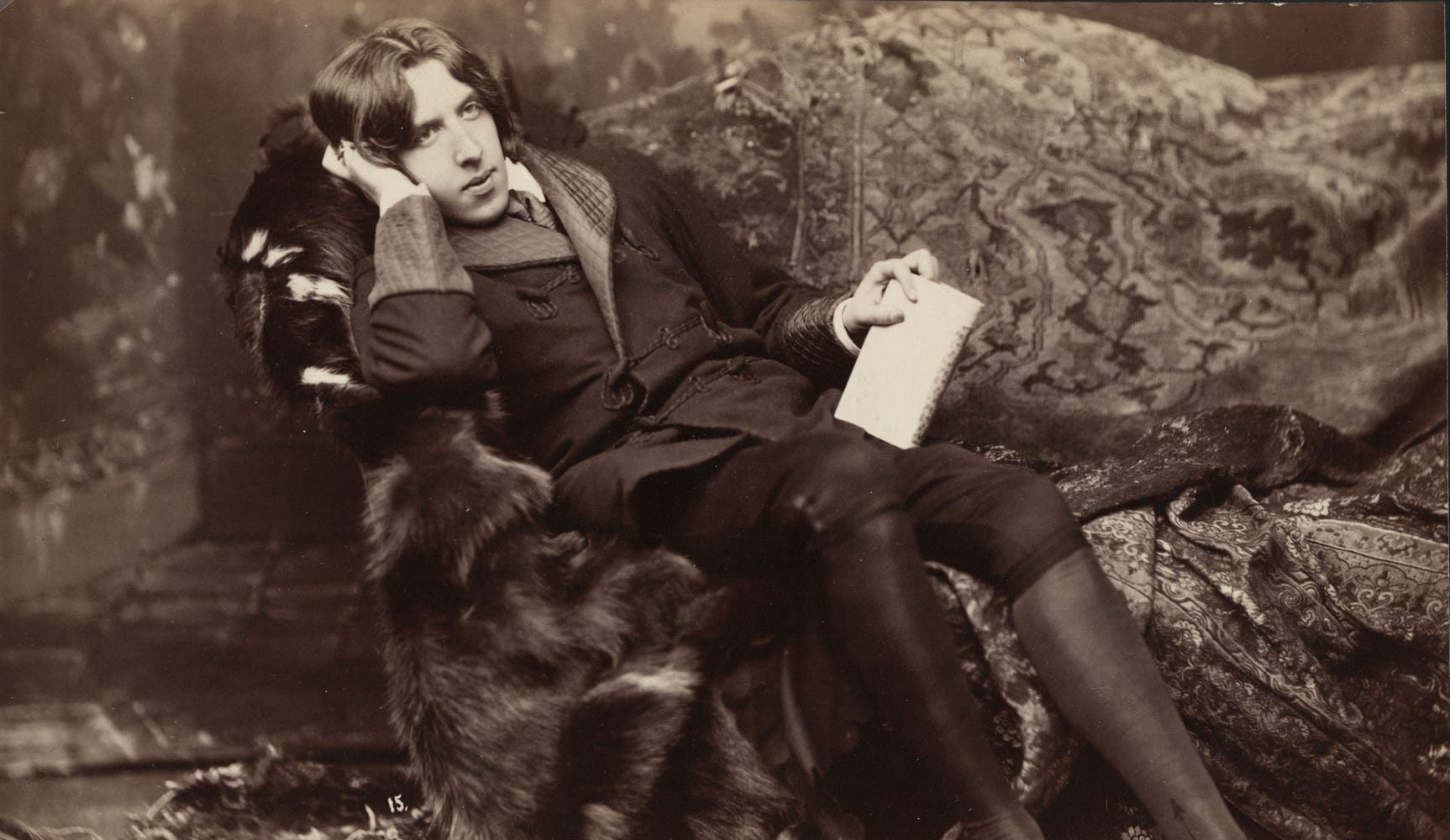 This clipping (Hartford Courant) says that Wilde carried with a fur rug, and if so, this may be what he is reclining on. It might, however, simply be his heavily fur lined coat, that the report mistook for a rug.