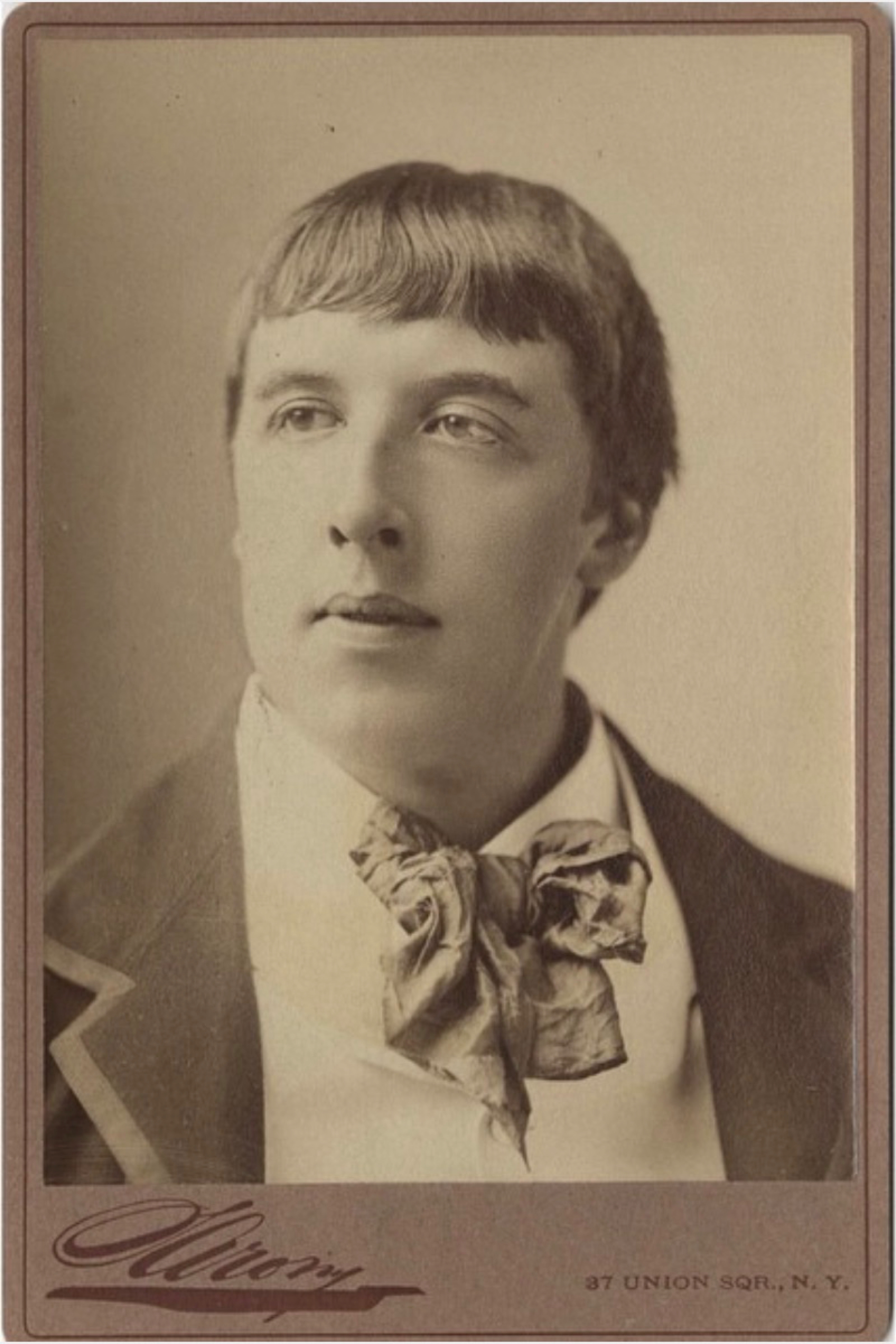The first of three known photographs from late Summer of 1883 when Wilde revisited America. He had his hair cut short in the Spring of that year in Paris in homage to a bust of Nero in the Louvre.
