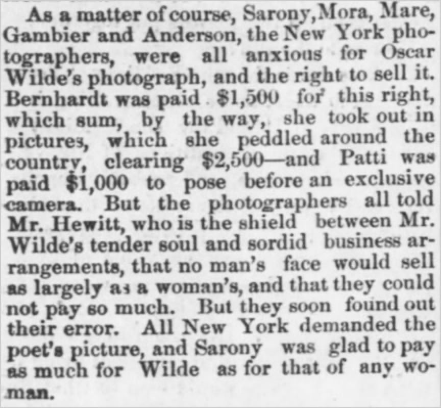 This is a common misconception, probably beginning with Lewis & Smith. Much evidence exists about the nature of Wilde’s remuneration, including Sarony’s own acknowledgment in interview, and his testimony in court (in connection with his Copyright Infringement Case) attesting to the fact that Wilde was paid, probably a lump-sum plus payment in kind via the sale of photographs.