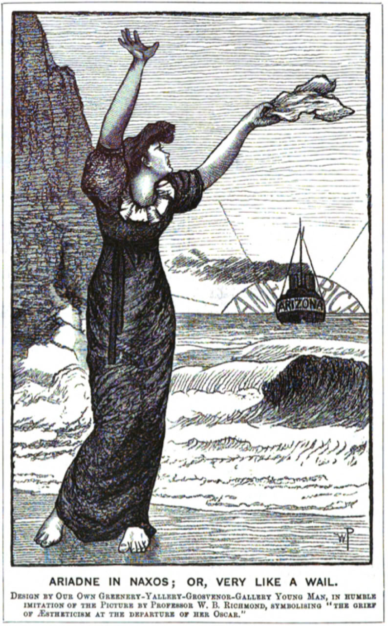 The cartoon was the centerpiece of a fake interview with Wilde, the purpose of which was to ridicule the Aesthetic Movement that Wilde was going to America to espouse. The image depicts the Greek goddess Ariadne who represents the grief of Aestheticism as she watches Wilde depart aboard the ship Arizona.