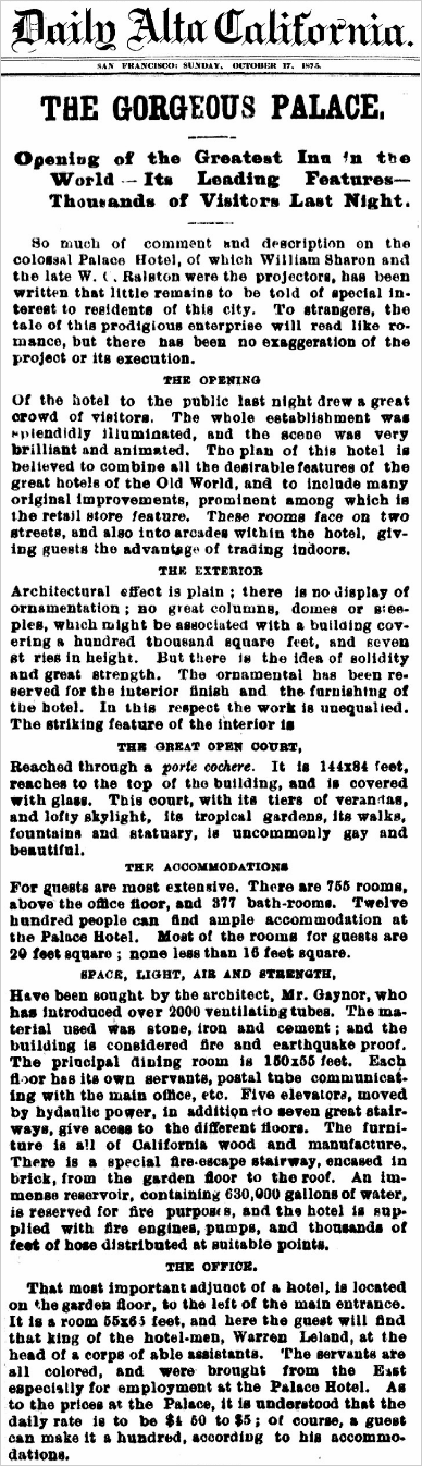 The original Palace Hotel was built by San Francisco banker and entrepreneur William Chapman Ralston who heavily depended on his shaky banking empire to help finance the $5 million project. Although Ralston's Bank of California collapsed in late August 1875, and Ralston himself unexpectedly drowned in San Francisco Bay on the same day that he lost control of the institution, it did not interfere with the opening of the Palace Hotel two months later on October 2, 1875. Ralston's business partner in the project was U.S. Senator William Sharon who had helped cause the collapse of the Bank when he dumped his stock in the Comstock Lode. Sharon ended up in control of the hotel as well as both the Bank and Ralston's debts both of which he paid off at just pennies on the dollar. (Wikipedia)