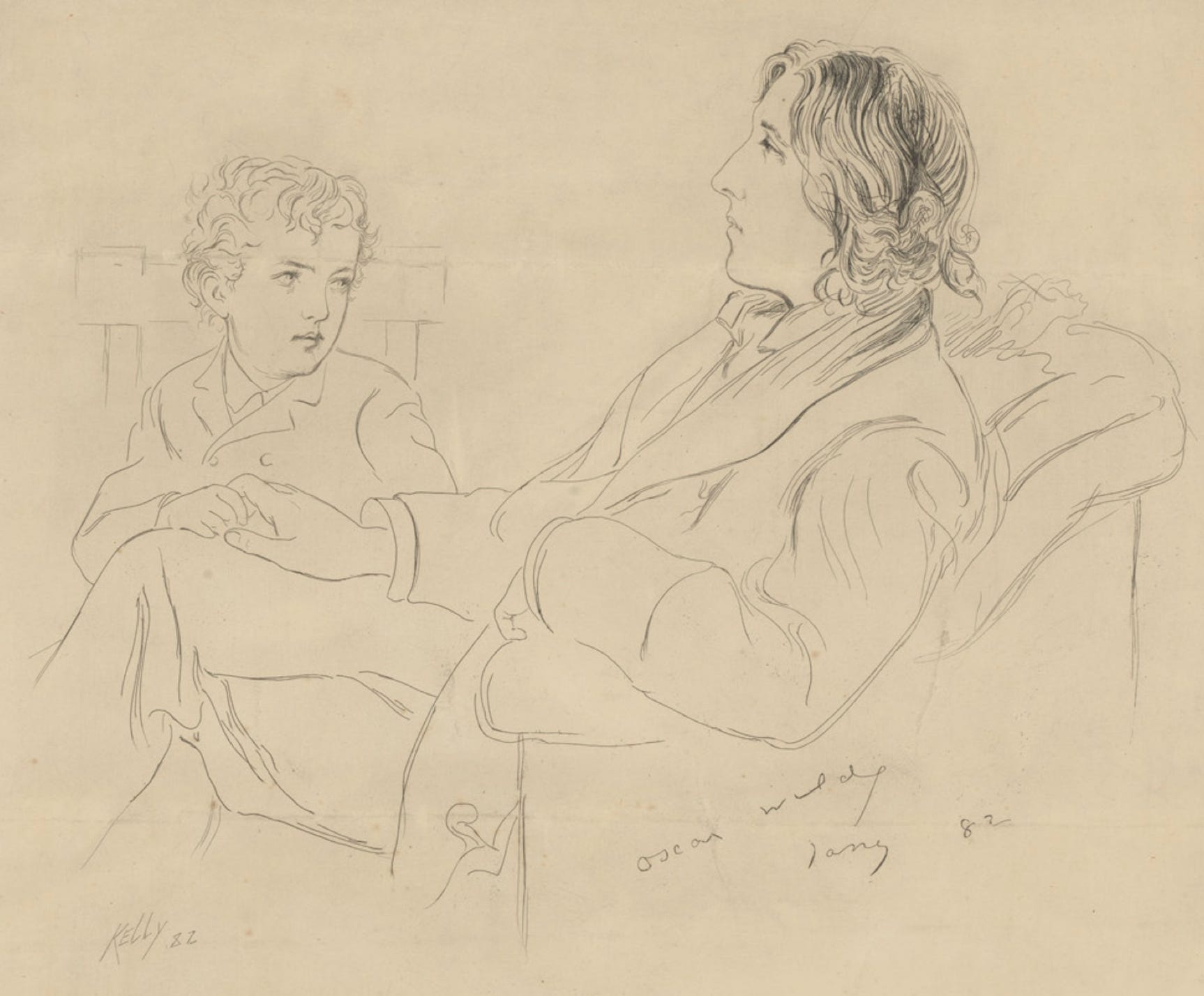 The drawing depicts Wilde, later famous for his children's stories, seated in profile perhaps as storyteller, alongside an unidentified child. It is often speculated that the boy was Kelly's son, but Matthew Sturgis in his biography Oscar Wilde (UK Edition: p. 778, n. 44) points out that Kelly had no son.