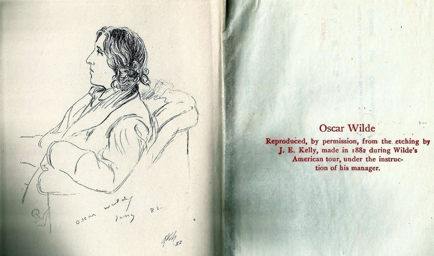 The artist chosen was James Edward Kelly (1855—1933), a New Yorker of Irish descent, who grew up during the Civil War. It was this upbringing, perhaps, that caused Kelly to develop a lifelong interest in American history—indeed the subjects of his sculpture and illustrations are often people and events of American military history. The connection with Wilde continued when, as the Complete Works [1] reminds us, "Kelly was commissioned to provide five full-page designs and nine tailpieces for Rennel Rodd's Rose Leaf and Apple Leaf (1882), to which Wilde contributed an introduction".