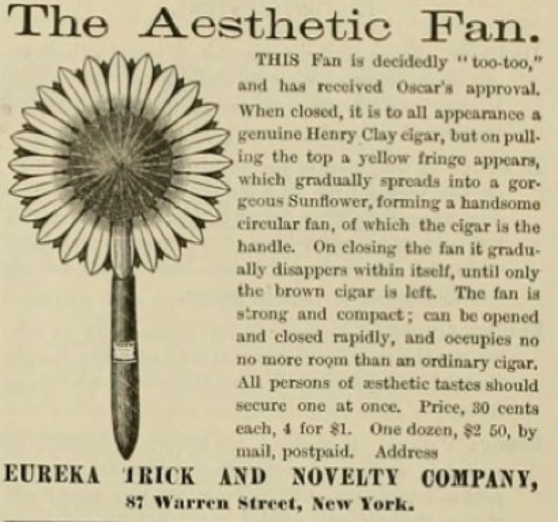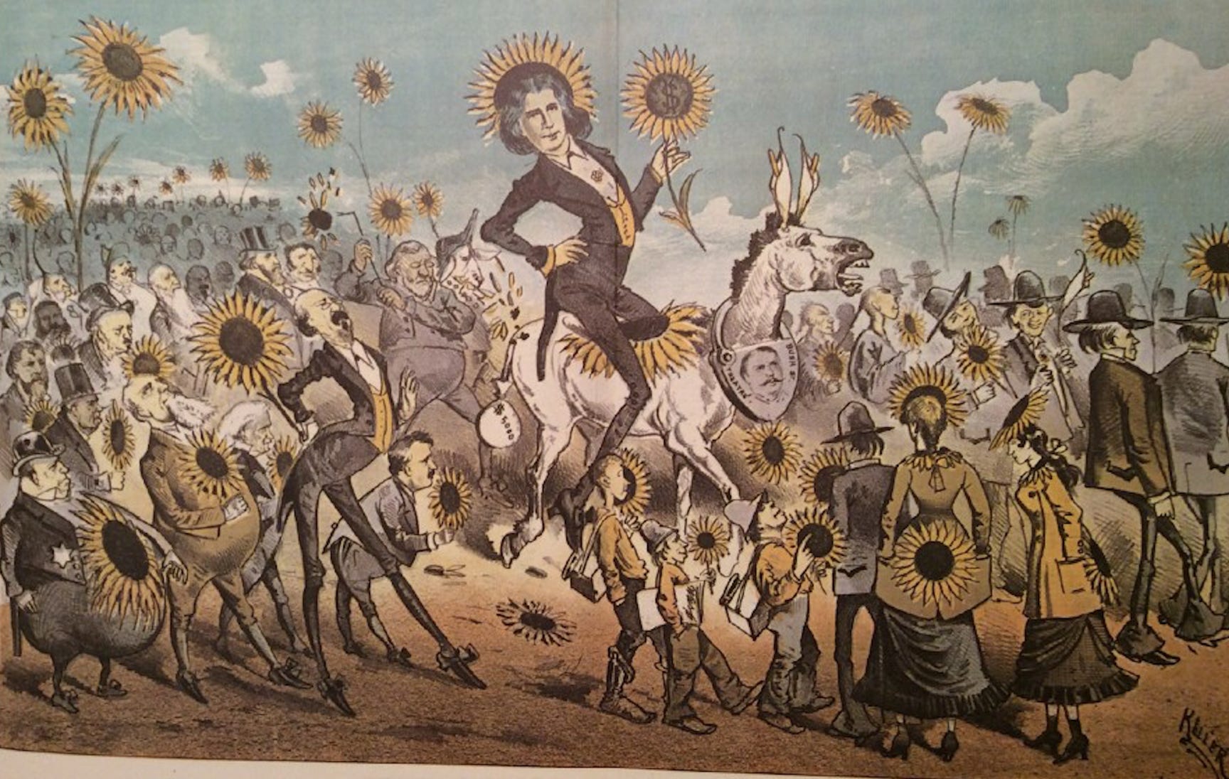 The cartoon shows such a crowd, but in satirical style, heavily featuring sunflowers, one of the floral emblems of the aesthetic movement; another, calla lilies, known to decorate Wilde's dinner table, serve as the donkey's ears.
