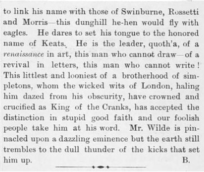 Ambrose Gwinnett Bierce (1842—c. 1914) was an American editorialist, journalist, short story writer, fabulist, and satirist. The day before Wilde's lecture he published this bitter attack of Wilde in his column entitled "Prattle".