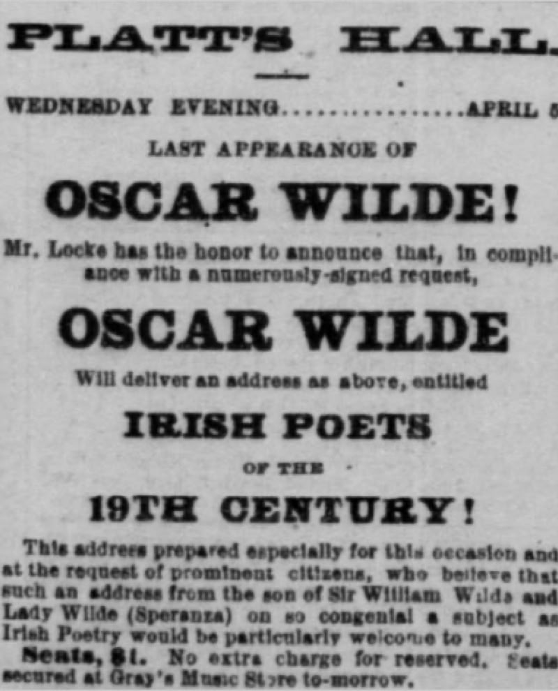 * As San Francisco was the only city in which Wilde lectured four times, this is the only time he gave the lecture on Irish Poets And Poetry Of The Nineteenth Century.