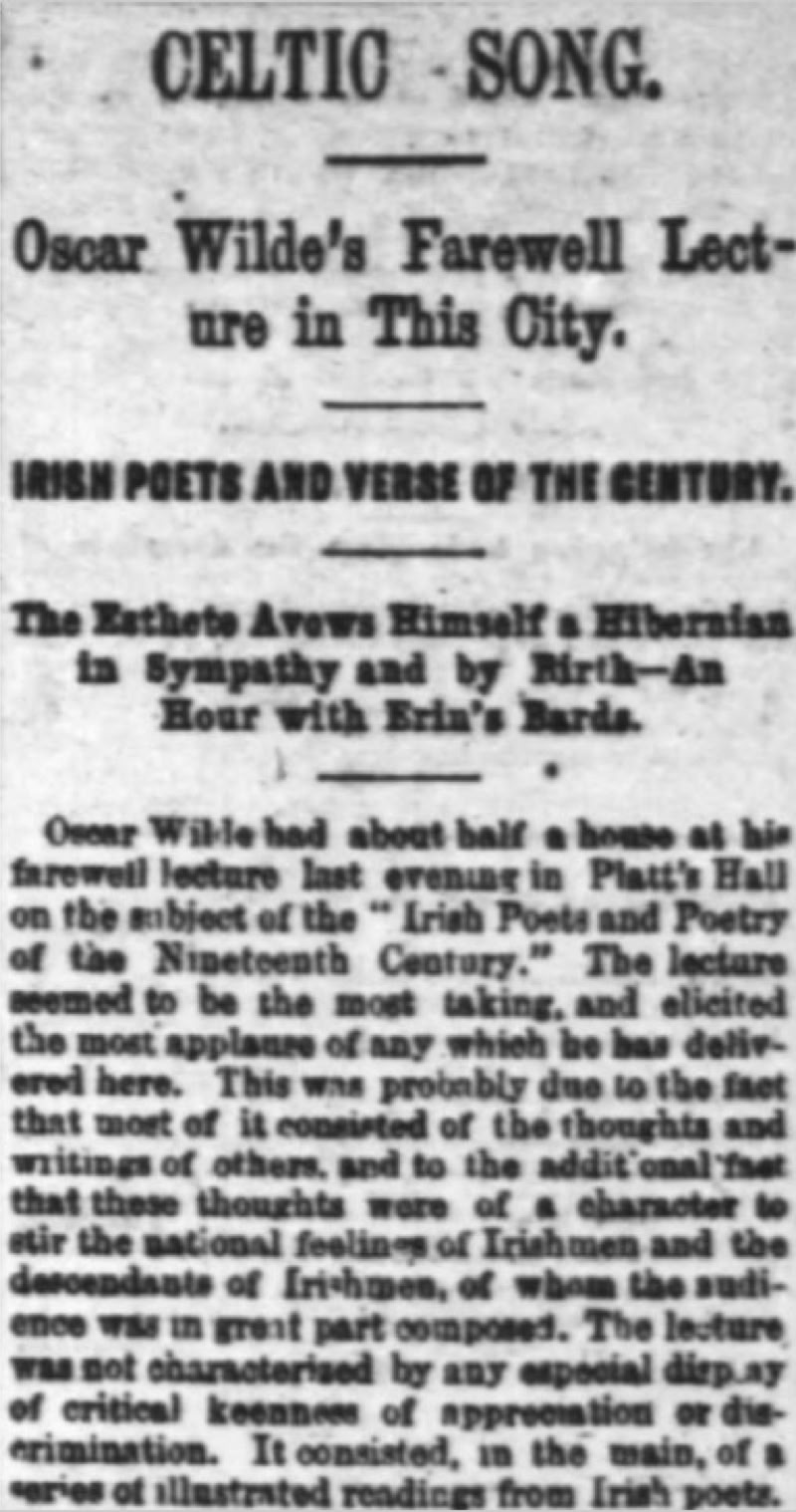 Wilde chose as his subject Irish Poets and Poetry of the Nineteenth Century, an idea he had hinted at on St.Patrick's Day in St.Paul, where he made a rare expression of Irish nationalist sentiment. On that occasion Wilde was called upon to give only an impromptu speech, and he talked in general terms about Irish achievement and how the English occupation had arrested, but not dimmed, the development of Irish art.