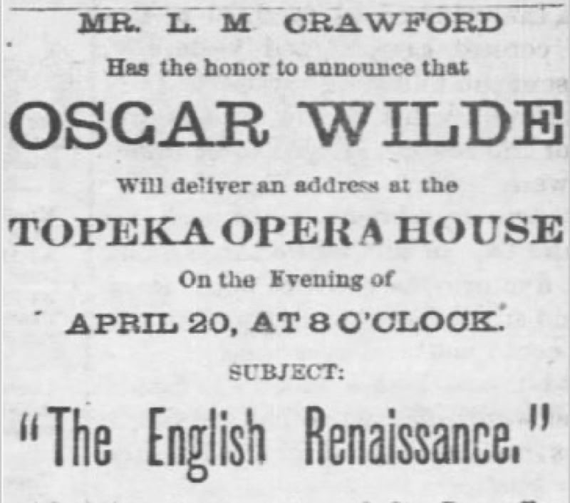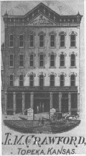 On this site Lorenzo Costa purchased an 1861 building and opened the first play house in Topeka in 1870. L. M. Crawford bought the property in 1880, made extensive alterations operating as Crawford's Opera House. This structure was destroyed by fire on December 2, 1880, and replaced the following summer by a new building where Wilde lectured.