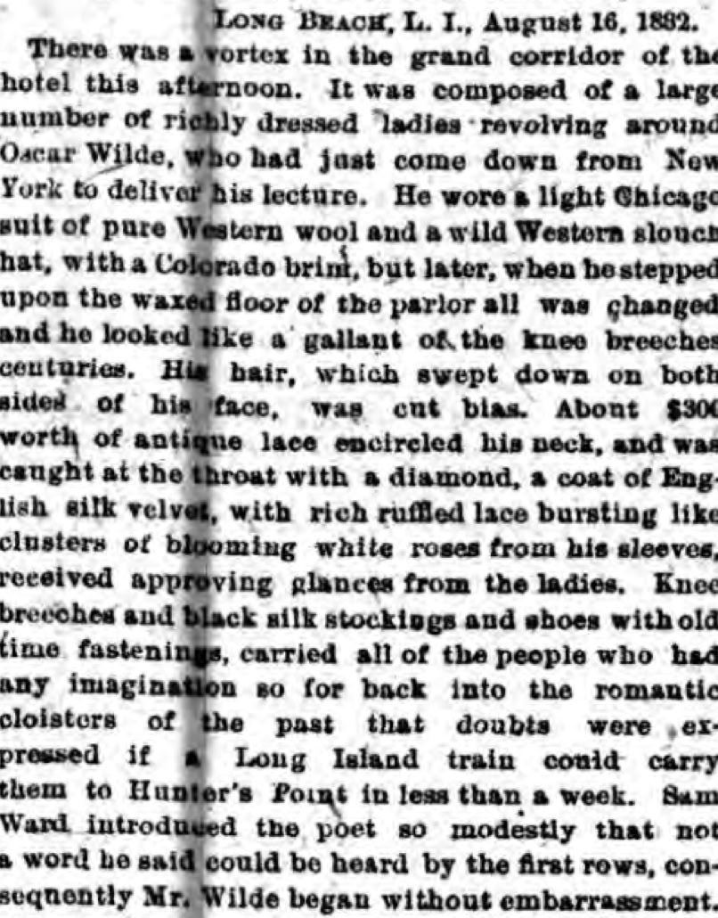 Given the one-day interruption to his Catskills itinerary, it seems likely that the Long Beach lecture was one of those prearranged when he vacationed at the resorts of New York, Rhode Island and New Jersey in July. For Wilde’s visit on that occasion see A Scene at Long Beach.