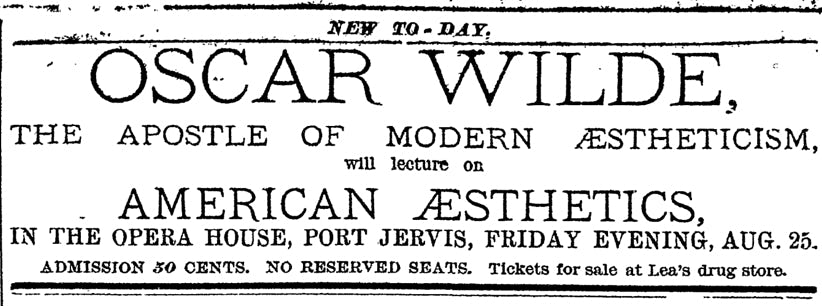 Opposite is an advertisement for a lecture at Port Jervis which did not take place. See the accompanying report of a G.W. Henderson claiming to be an agent for Oscar Wilde.