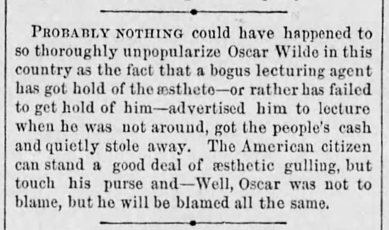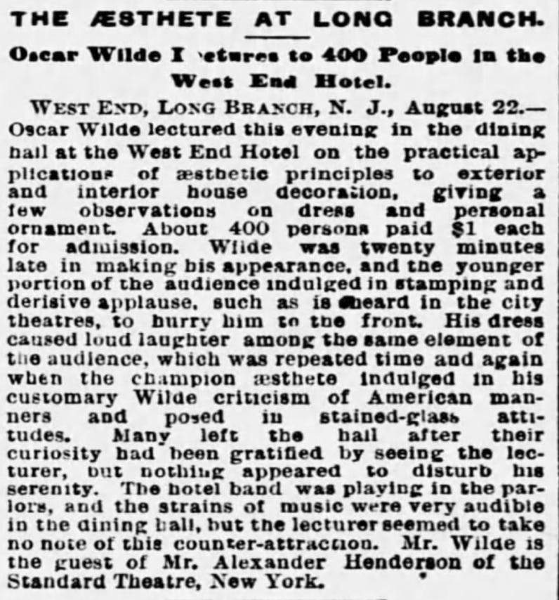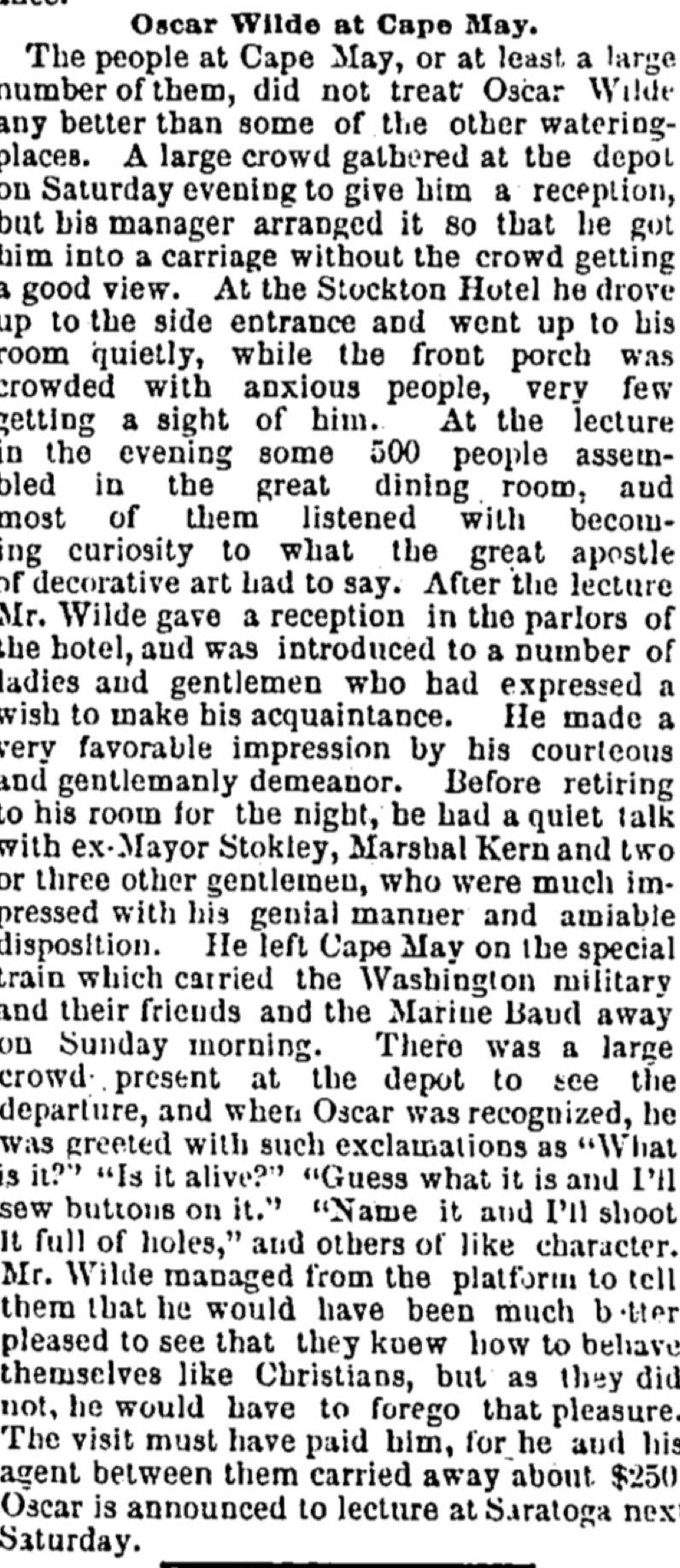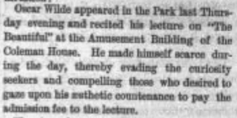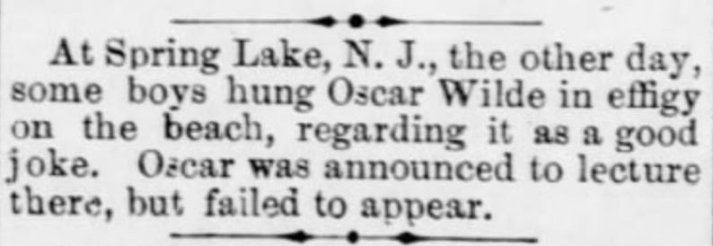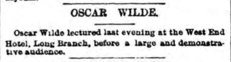 “Oscar Wilde recently lectured at Sea-bright, and according to the Sentinel, he was very dreary and uninteresting putting many of his audience to sleep.”