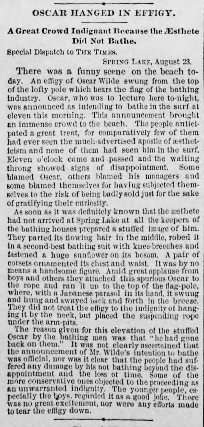 No newspaper reports have been found a testing to the lecture in Spring Lake taking place. This is supported by reports that Wilde, “who was to lecture” failed to appear as announced, and his absence led some local boys to hang (by the arm-pits) an effigy of Oscar from a flagpole, complete with corset, sunflower, knee-breeches and Japanese parasol.