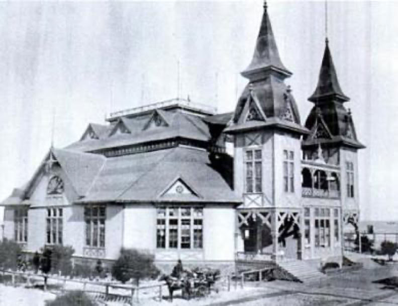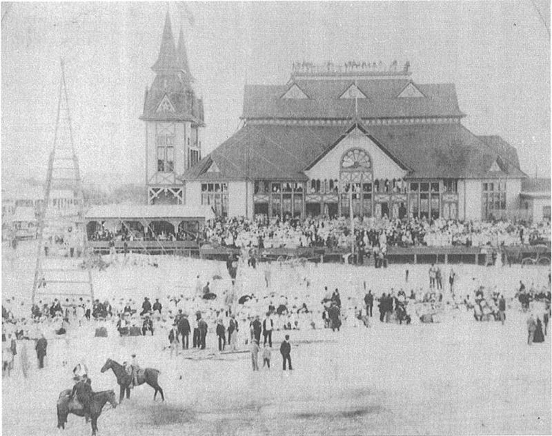 * This photograph is sometimes shown incorrectly reversed; the towers of the building were on the left when viewed from the beach.
