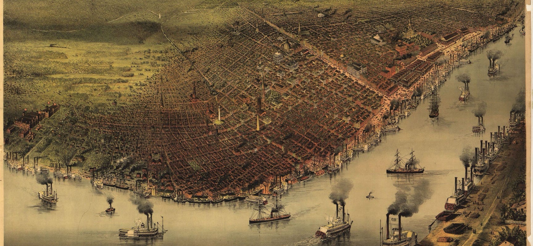 The City of New Orleans c. 1885 with the Mississippi River in the foreground, and Lake Pontchartrain on the horizon. Spanish Fort is on the lake in the distance, a five mile journey by steam train from the depot at Canal and Basin Streets, price fifteen cents.