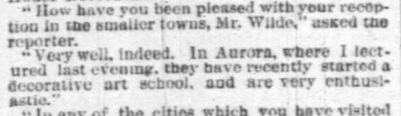 No record is currently available as to whether Wilde stayed overnight in Aurora, but it is entirely possible he traveled on by train the 50 miles to Chicago, which was his base for this midwest leg of the tour.