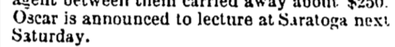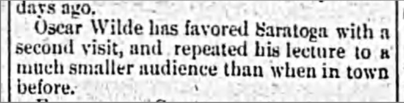 Wilde had lectured at Saratoga on August 10 as part of his tour of the Catskills. He returned briefly after his tour of the Jersey Shore to stay with friends and lecture for a final time at the resorts at the end of the season.