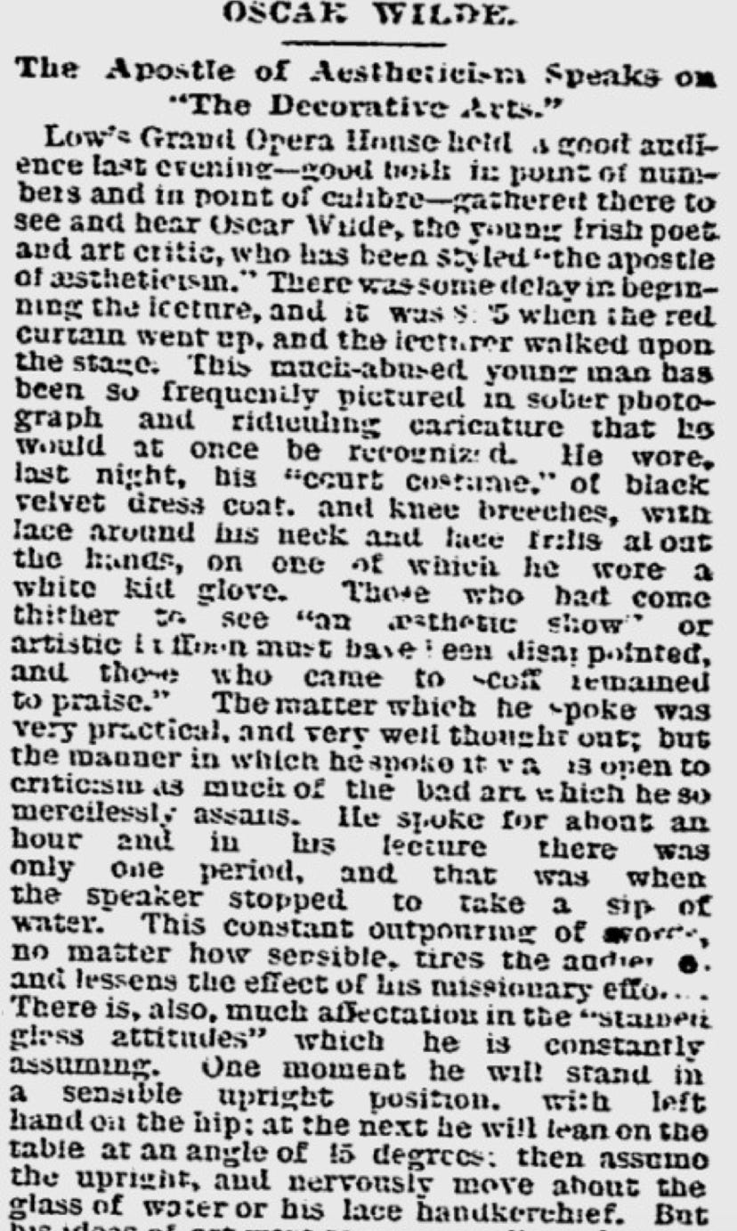 "What's coming? Oscar Wilde, to be sure. Coming! He is here in fact, and will deliver his lecture on 'Decorative Arts' in Wamsutta Opera House this evening ...