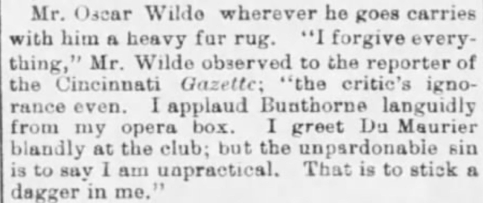 “Oscar Wilde’s solid ivory cane arrived by express Saturday. he left it at Central City, Col., and it is following him up.”