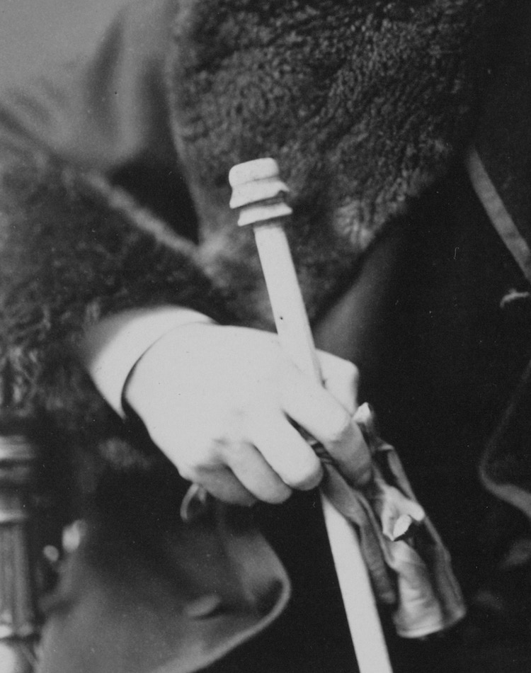 The seal ring has now moved to his left hand: probably an artistic move by Sarony. Note the tear in the chair’s upholstery. This image has been colorized at the top of the page.